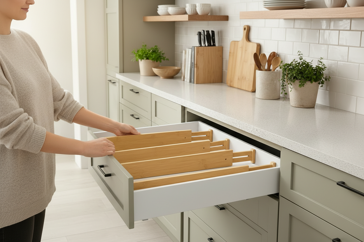 Adjustable Expandable Bamboo Drawer Dividers Set of 4 — Spring Loaded Drawer Separator for Kitchen Dresser Bedroom Bathroom Desk Organization