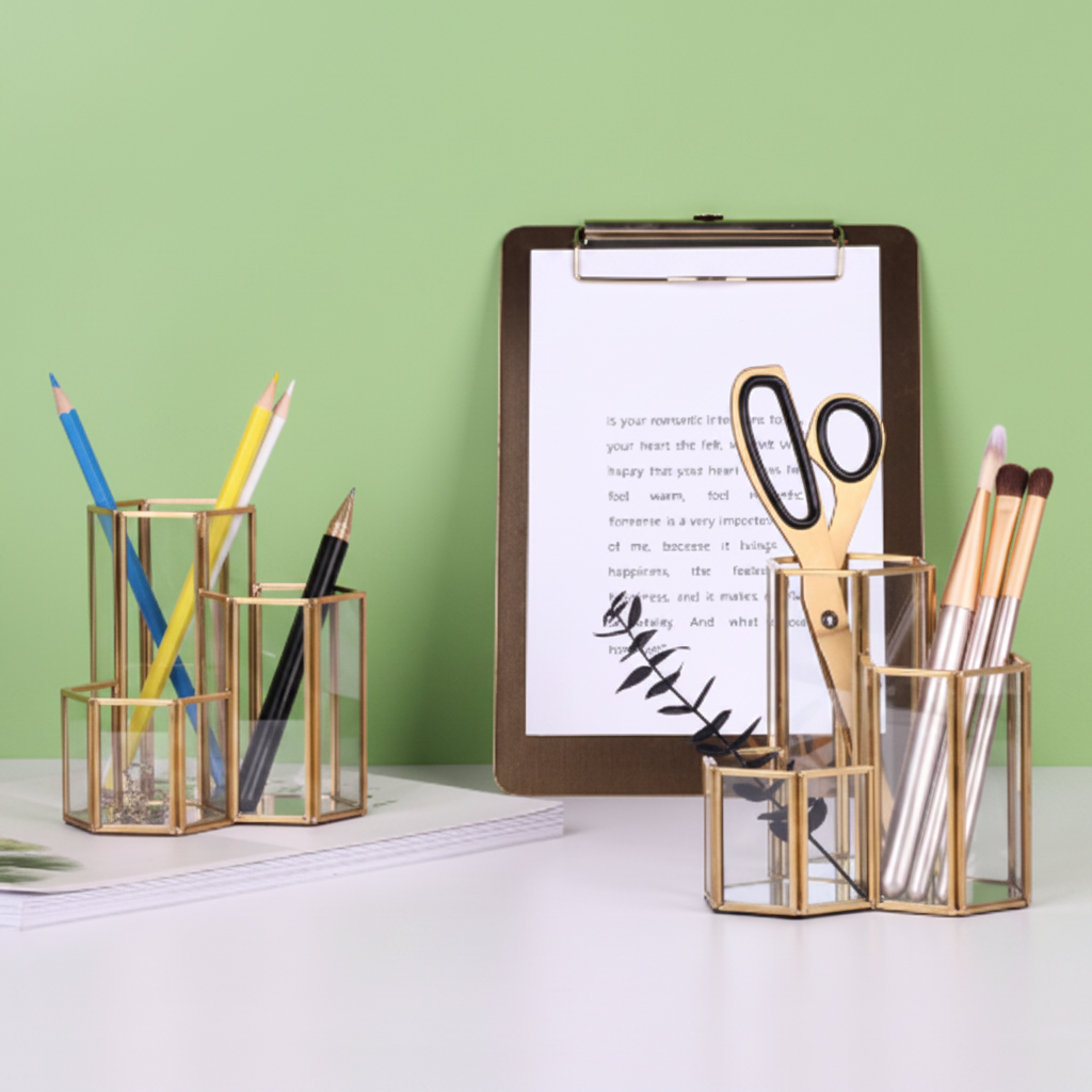 Makeup Brush Organizer Cylinder — Gold Geometric Storage Box for Vanity Desk Dresser — Cosmetic Brush Holder Display